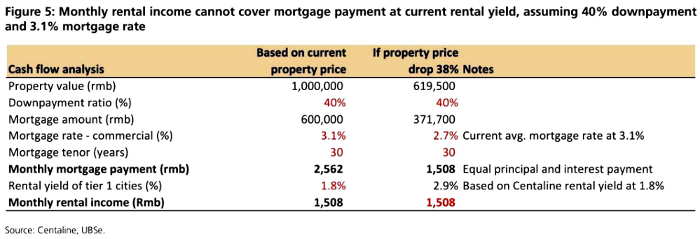 当然,我没有那么悲观,因为随着美联储降息,我们未来的利息也会不断下降。瑞银只假设下降0.4%,其实拉长时间来看应该是不止的。所以只要房租能稳住,其实房价下跌的幅度就会被控制在40%以内。